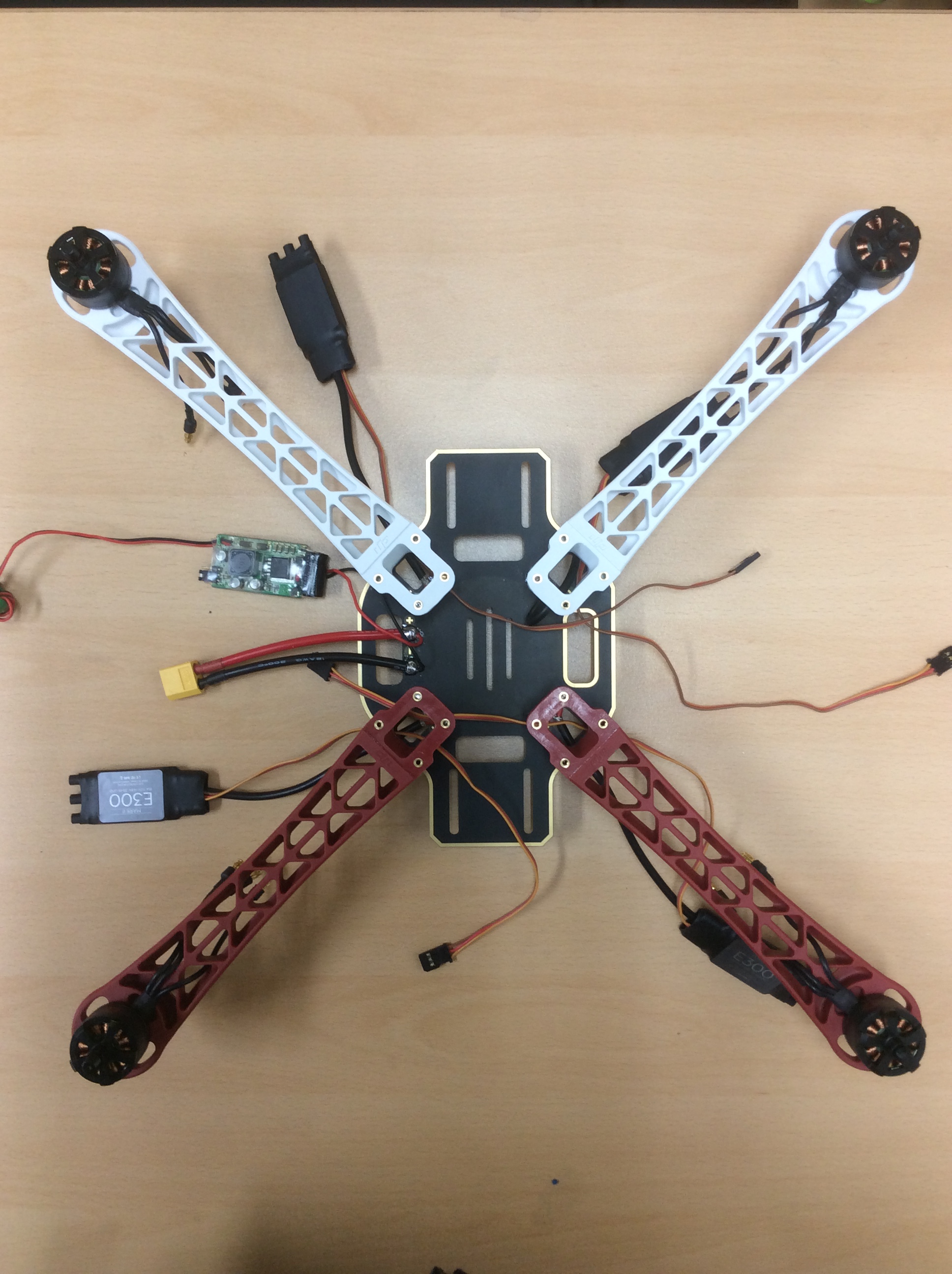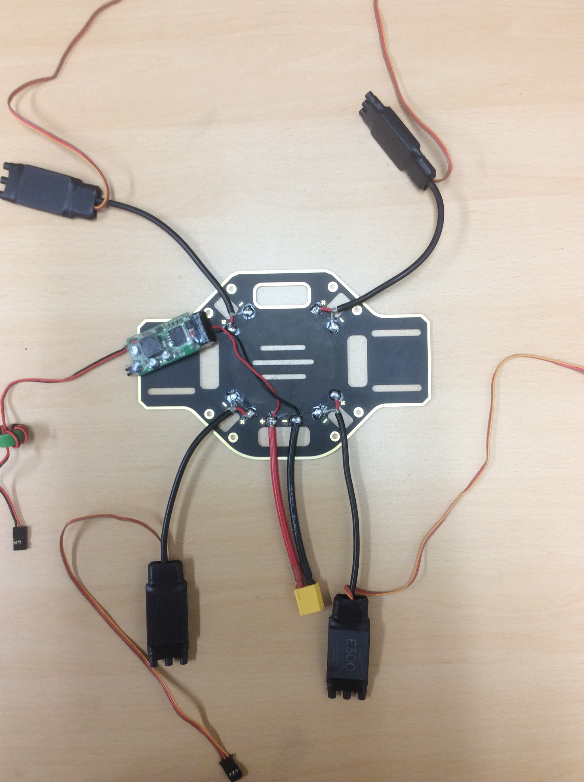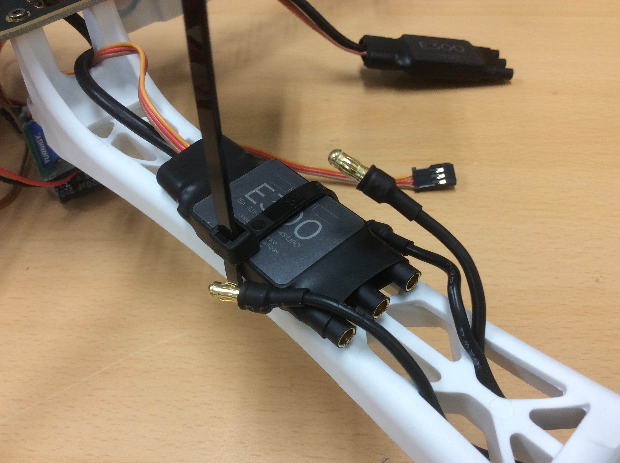 - After assemble arms on plate, fix each ESCs with arms. Fix UBEC module as well.